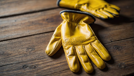 A pair of elegant leather gloves rests on a sunlit wooden windowsill, showcasing rich textures and warm tones, perfect for a cozy and stylish atmosphere.