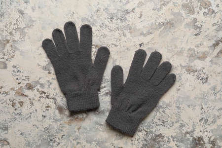 A pair of warm grey knit gloves rests on a wooden table. The natural texture of the wood complements the cozy feel of the gloves, perfect for autumn and winter wear.
