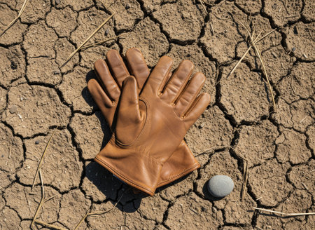 Brown leather gloves resting on dry cracked earth with scattered twigs and a single stone under bright sunlight.