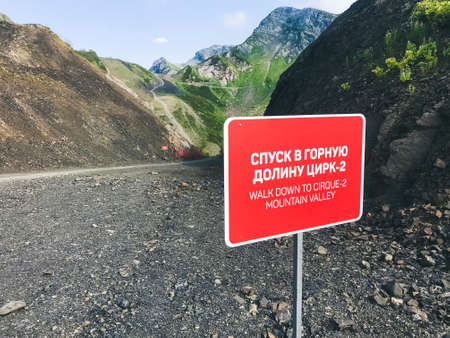 Majestic mountain scene featuring a prominently placed warning sign amidst lush green grass and rocky terrain during a stunning sunrise.
