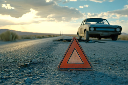 Emergency warning triangle positioned on a desert road behind a broken down car at sunset, signaling danger and the urgent need for roadside assistance in a remote landscape