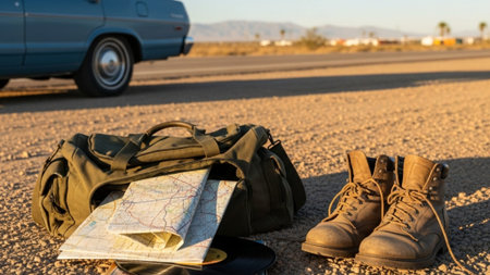 A cinematic environmental wide shot (16:9) depicting a road trip still life on the shoulder of a dus