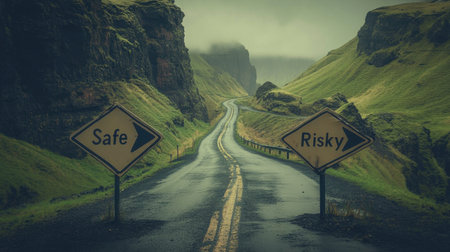 A serene road scene featuring signs indicating 'Safe' and 'Risky' choices, set against a lush green landscape with foggy mountains.