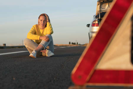 a girl sits on the pavement near a broken car, upset, worries next to it is a white-red emergency stop sign. The girl is waiting for help with a broken car, there is a place for an inscription