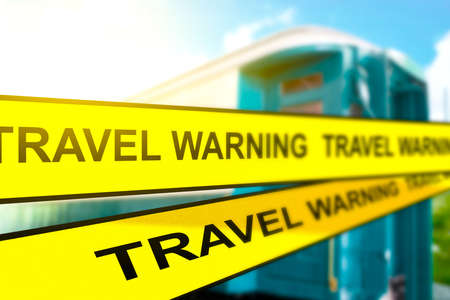 Prohibition tape next to travel suitcases. Yellow ribbon symbolizes danger to tourists. Concept - ban on tourists. Suitcases for traveling on background of city. Tourism industry sunset. Quarantine