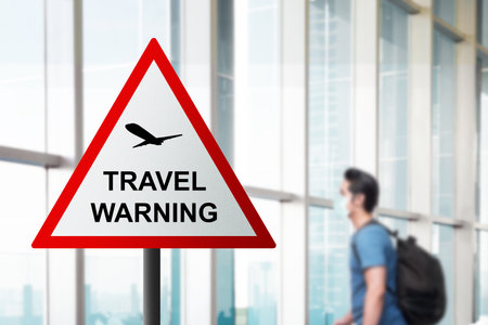 Caution sign of new variant of covid 19 omicron on the airport. Travel Warning concept