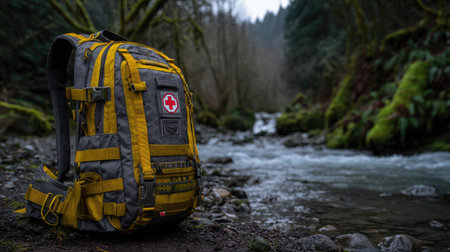 A vibrant outdoor backpack rests beside a scenic river, surrounded by lush greenery. Ideal for camping and hiking adventures, this backpack merges style and practicality.
