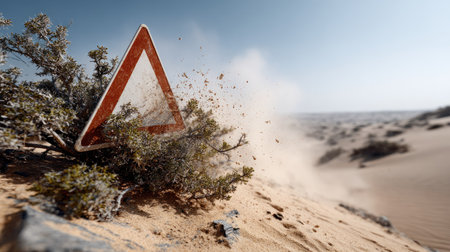 A solitary warning sign emerges from a sandy desert landscape, partially obscured by a cloud of dust. Surrounding shrubbery adds contrast in this stark environment.