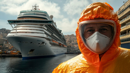 A crew member wearing a bright orange protective suit and mask stands near a large cruise ship docked in a busy port. The sky is overcast, suggesting a cool atmosphere.