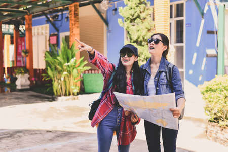 Happy traveler and tourism women travel summer on the beach. Asia smiling people holding map and camera planning travel trip and relax outdoor for destination and leisure. Summer Vacation Travel Concept, copy space for banner