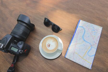 Aerial view of camera , coffee cup , map and sunglass on the old wooden top.