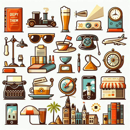 A vibrant and playful design showcases airplanes, cars, and iconic landmarks like a clock tower, promoting travel and exploration with a whimsical touch.
