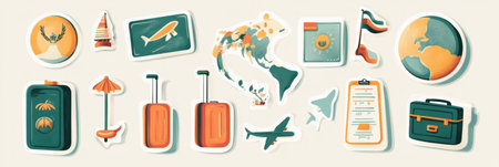 Various travel themed stickers display a vintage style, including maps, luggage, and aviation items. These designs evoke wanderlust.