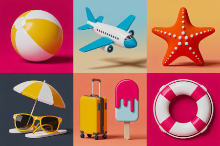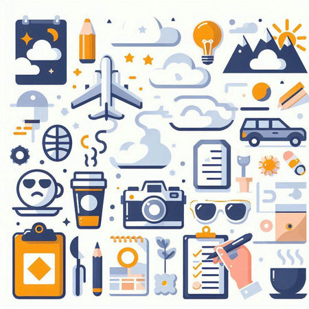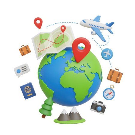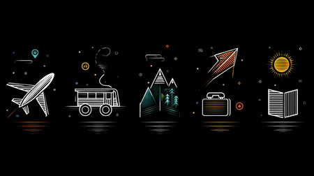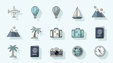 A set of minimal floating icons depicts travel elements like transport, destinations, and scenery, ideal for your planning needs.
