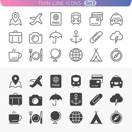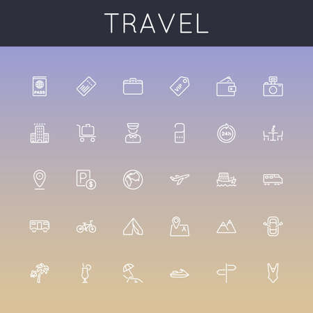 Vector travel, vacation and tourism related set of 25 color outline icons for UI, web design. Airplane, ship, train, other transportation symbols; passport, boarding pass, suitcase, map, hotel signs