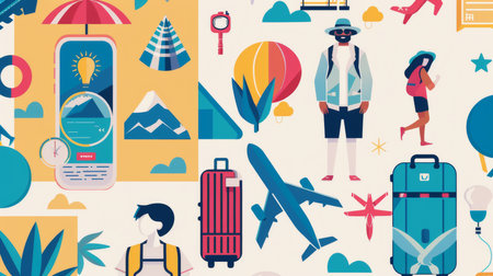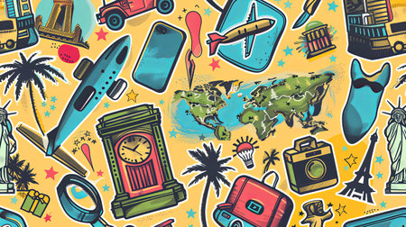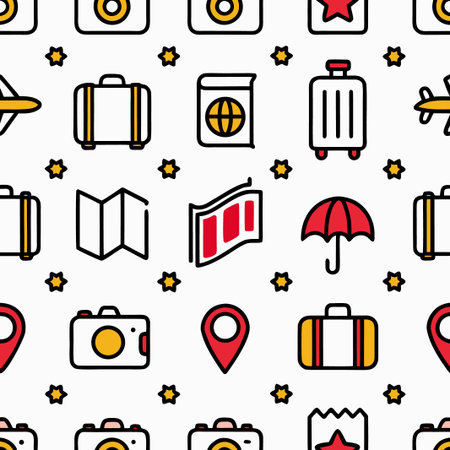 Seamless pattern of travel icons. Simple line art and colored shapes depict suitcases, passports, maps, cameras, airplanes, and more. Stars and dots create a grid background