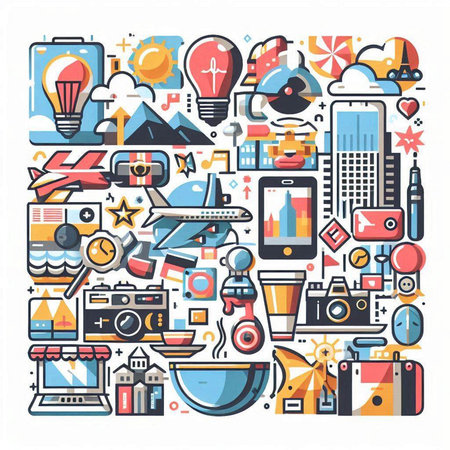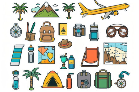 Adventure awaits with this colorful array of travel icons, from mountains to maps. Perfect for wanderlust enthusiasts. Explore the world and dream of new destinations. Generated A.I.