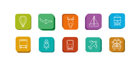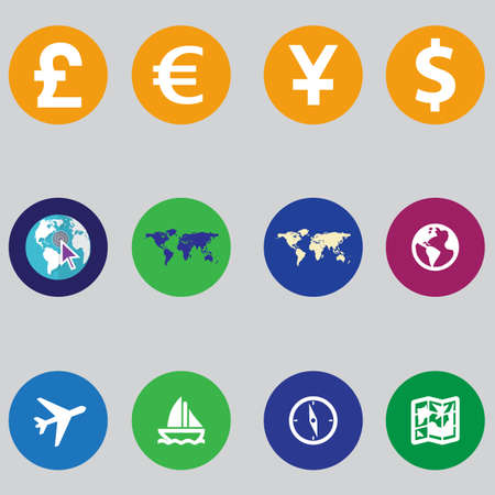 Travel and tourism flat icons set. Airplane, plane, ship, ship, yacht, boat, cruise, sailboat, lighthouse, compass, binoculars, compass, binoculars, steering wheel, airship. Vector illustration