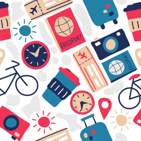 Seamless pattern travel and vacation. Tourist items - passport, tickets, transport. Vector illustration