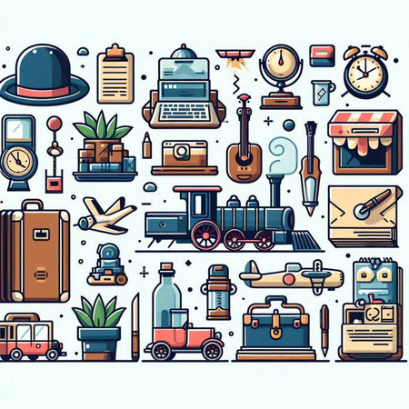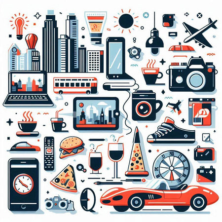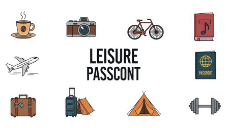 An illustration showcasing various leisure activities and travel essentials. The image includes a cup of coffee, a camera, a bicycle, a musical note, an airplane, a book, a passport, a suitcase, camping gear, and a dumbbell. These items represent different hobbies and travel-related pursuits.