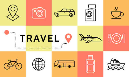 Travel and vacation concept. Vector illustration in line art style with icons.