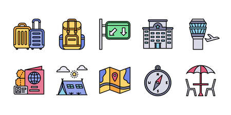 Travel icon set backpack suitcase hotel airport passport compass cafe with filled color style flat design vector illustration.