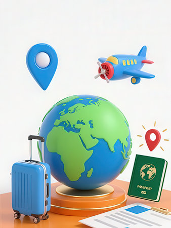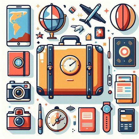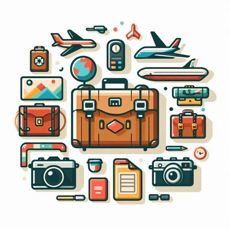 Colorful travel icons and suitcases with global map and airplane illustration. That the image is generated using AI.
