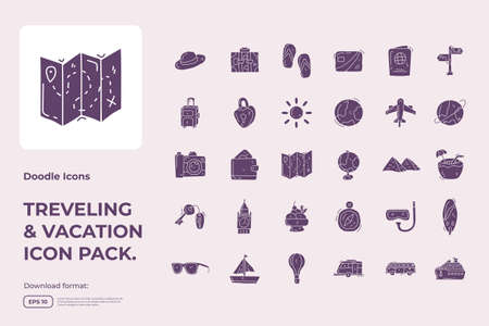 A grid of hand-drawn icons representing various travel and adventure elements, including transportation, destinations, and essential gear.