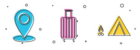 Set Map pin, Suitcase for travel and Tourist tent with wood fire icon. Vector