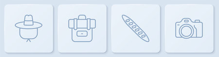 Set line Camping hat French baguette bread Hiking backpack and Photo camera. White square button. Vector.