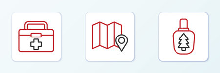 Set line Canteen water bottle First aid kit and Location of the forest on map icon. Vector.