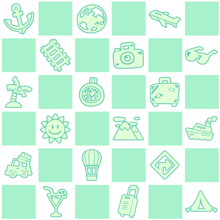 Green seamless background of travel/vacation pattern theme. Freehand drawing in cute style. Vector illustration.