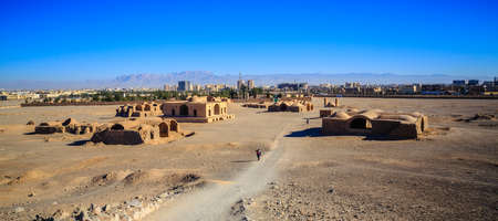 Yazd, Iran - May 2019: Tourist walking inside ruins of Zoroastrians Dakhmeh Towers of Silence in Yazd city