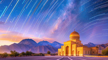 A breathtaking view of a majestic mosque surrounded by mountains, showcasing star trails and the Milky Way at twilight, creating a serene atmosphere.