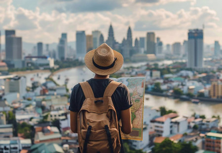 Asia tourist looking at map. Beautiful tourist attractions. generative ai