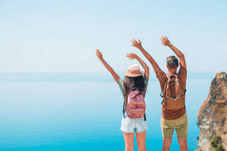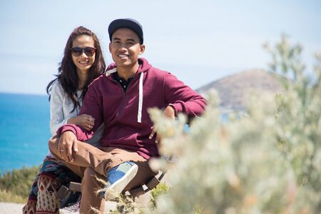 Happy couple of tourists with backpacks traveling on the coast of Italy.
