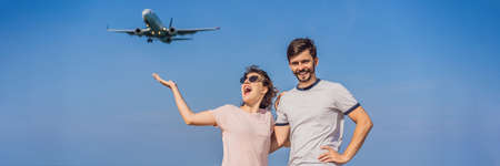 Man and woman tourists have fun on the beach watching the landing planes. Traveling on an airplane concept. Text space. Island Phuket in Thailand. Impressive paradise. Hot beach Mai Khao. Amazing landscape BANNER, LONG FORMAT