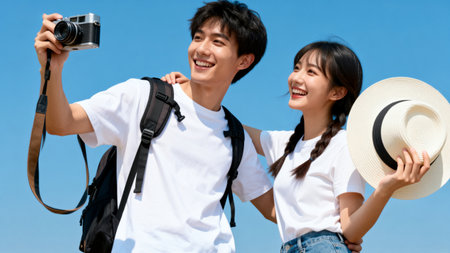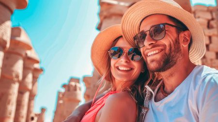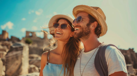 Smiling couple exploring ancient ruins and historical landmarks during their summer vacation, immersing themselves in local culture and history.