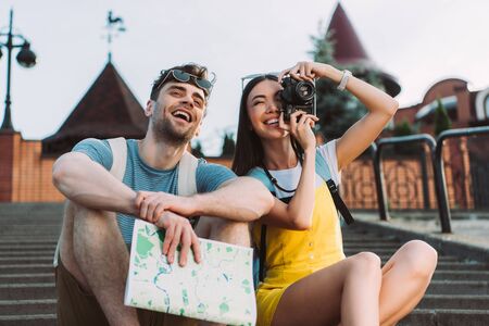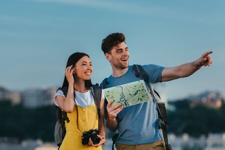 Smiling multiethnic tourists with backpack and retro camera standing on urban street