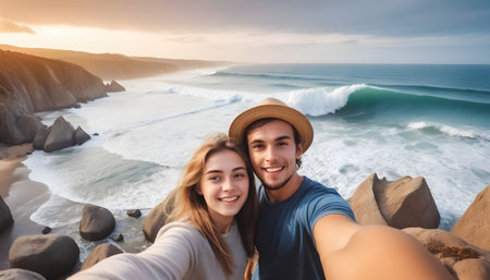 young couple tourist traveler makes selfie with beautiful rocks cliffs stones boulders and huge big surfer waves and natural panorama view on the beach