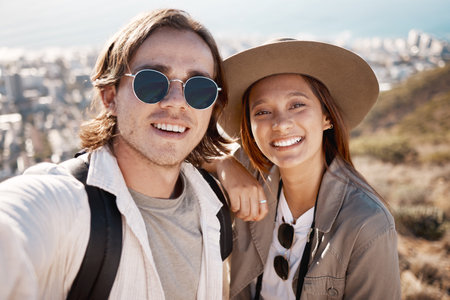 Nature, selfie and couple hiking, fitness and workout for wellness, healthy lifestyle and romance. Portrait, man and woman on mountains, hikers or holiday for adventure, journey or happiness together