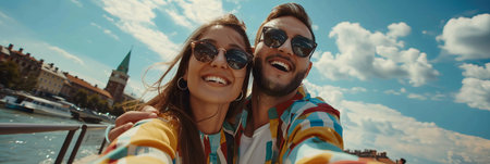 Stylish couple posing for a selfie on a city street during their summer vacation, capturing the excitement of urban exploration.