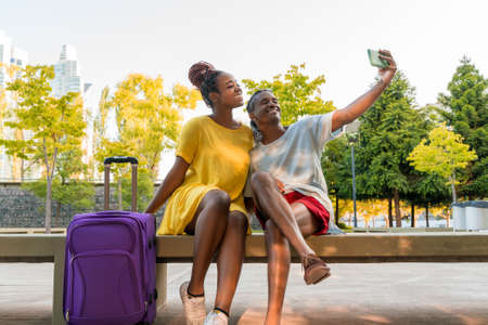 Portrait of two young friends spending good time together and taking a selfie with smartphone outdoors against the sea.