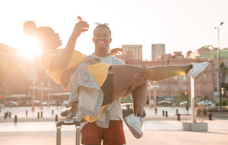 A happy boyfriend carrying and holding his girlfriend on a trip to the city.