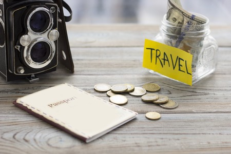 Passport and money for travel summer on wooden table
