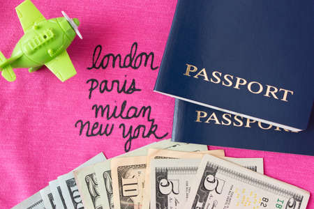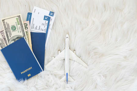 Travel concept, toy plane, passport, money
