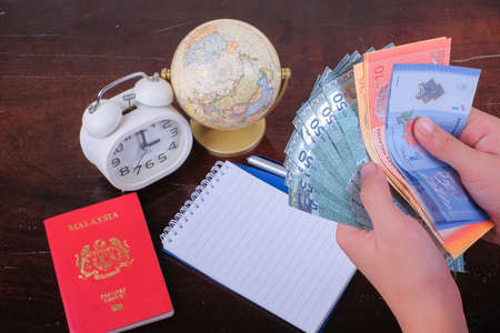 Accessories of travel concept with note book, globe, passport, money and alarm clock on wooden background