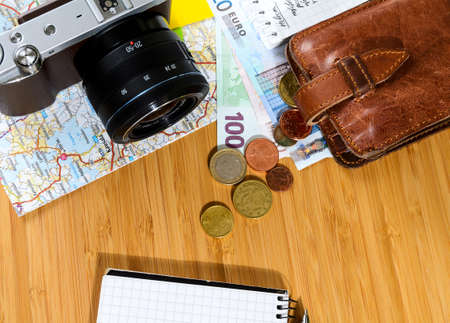 getting ready for travel, money, map and photo camera on wooden table with copy space