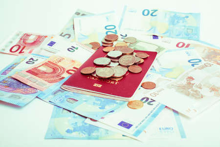 Passport with Icelandic krona banknotes and coins.