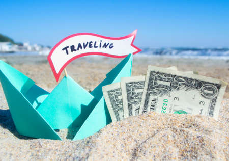 Small blue paper boat, three one paper dollar bills and speech bubble with word Traveling on sandy sea beach on sunny summer day. Concept money finance business tourism travel dreams vacation holiday
